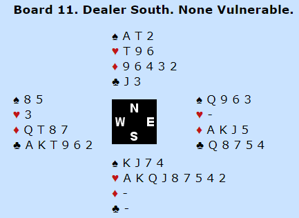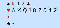 Over svenskens 4 grand fikk han vite at makkeren hadde spar ess! Men så kom Zimmermann med fra vingen (øst) med 5 grand (typisk en tofarget hånd). Da Ø/V var med til 7 kløver over syds 6 hjerter tok syd sjansen på 7 hjerter. Makkeren la opp kun A-10-x i spar og ingenting annet. Sparen måtte tippes. Svensken spilte på at vest hadde damen da han trodde øst hadde en ekstrem minorhånd, men det var feil. Slik så hele spillet ut: