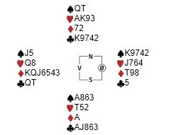 Etter et ukontrollert meldingsforløp hvor den ene prøvde å stoppe i 5 kløver og den andre lett løftet til slem skulle Stig forsøke seg i 6 kløver. Vest hadde hoppet inn med 3 ruter over kløveråpningen.