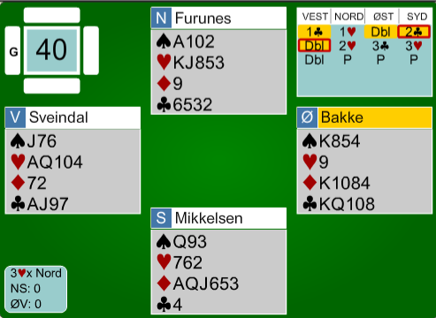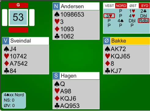 Normalkontrakten var 4 spar spilt av syd. Vanlig utspill var ruter 10 etter at øst hadde åpnet med 1 ruter. Det ser vanskelig ut å få fatt i overstikket. To hjerter kan nok stjeles hos nord, men idet A-K i ruter tas for å kaste unna to kløver trumfer vest og frir seg med hjerter. Idet øst kommer inn på trumfesset over kongen (ingen flere trumf hos nord) spiller han ruter, og vest får uppercut for trumftieren – forsvarets tredje stikk. Noen stjal en hjerter i andre stikk og kastet hjerter 10 på ruter ess, så kløver mot hånden. Hvis øst stikker den og spiller trumfesset fulgt av ruter får også forsvaret tre stikk, vests spar 10 vokser opp til stikk. Men i den situasjonen ble det spilt mer kløver fra enkelte, og mer hjerter fra noen andre. Da ble det elleve stikk, noe som skjedde ved åtte bord (av 27), og N/S fikk +19 for +450. Det vanligste var +420 som ga akkurat middels. Lederparet satt mot 4 spar med ti stikk. Sveindal-Bakke noterte +450 for +19, mens treerne spilte mot et av de fem parene som gikk bet i 4 spar, og det ga +22 til Ø/V.