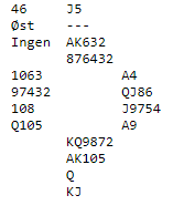 Ru K tok 1. stikk, hvor ru D satt skal tåkelegges. Så var det bare å utnytte den viten Øst sin åpning ga. Hj 9 til liten fra Øst og 10-eren vant. Så fyrte han av 6 stikk fra topp i hjerter og sakte på dem tre spar samt ru 4,6 og dame. Øst som hadde hatt sp AKJ- hj D54- ru A10973- kl 93 beholt ståstikk i ruter og spar, men da fire ganger kløver så ble raket inn var presset stort på 12. stikk. Sake sp A eller ru A? Da ru A ble lagt kunne Johnsen ta sitt 13. stikk for ru 2!Ingen andre vant utgang på spillet- kassa altså- men bravur!