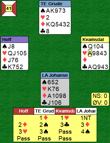 Grude fikk meldt sine kort godt, og siden Johansen etter 3 spar fra nord visste om 6-5 hånden hos makkeren meldte han 4 spar. Det var toppkontrakten, ti stikk og +420.