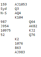 Etter to passer åpnet Bakke (nord) med 1 grand (15-17), og nestemann doblet. Sveindal passet, og vest sa 2 ruter. Det gikk pass-pass tilbake til Sveindal.