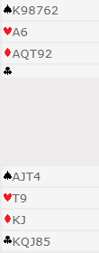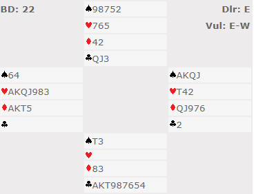 Det står vel mellom 6 ruter, 6 hjerter, eller storelsem i en av de fargene. Ved over 70 % av bordene ble det meldt storeslem direkte, noen steder 7 hjerter, andre sa 7 ruter. Slik så hele spillet ut: