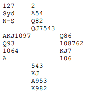 Han passa først. Nestemann åpnar med 1sp (presisjon, 5+ spar og maks 15 hp), pass hos makker og 2sp frå neste. Mange ville vel passa, men Jon viste at han er på medaljejakt då han meldte 2NT for å syne begge minor. Aggressivt, men han veit at makker har maks 2 spar. Åpnaren er også begrensa, så makker har sannsynlegvis ein del. Åpnaren meldte 3 sp, Tor 4kl som vart sluttkontrakten. Heile spelet såg slik ut:
