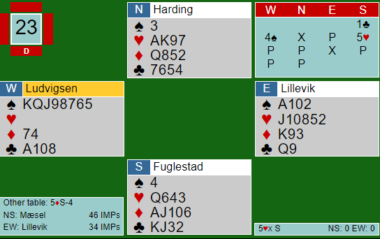 I 5 ruter hvor trumfen altså satt gunstig fordelt med kongen i saks ramlet det likevel sammen. Etter spar til øst spilte forsvaret to runder kløver, og da spillefører forsøkte å komme seg over til nord for å ta trumffinesse begynte Ø/V å stjele. Kontrakten gikk fire bet i sonen, men å notere +400 var likevel 9 IMP ut for lag Mæsel, men de vant likevel kampen med 3 IMP.