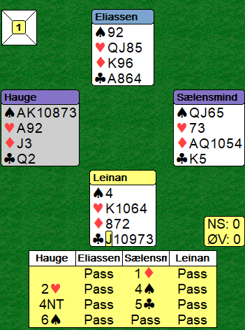 Kløver knekt kom i utspill, og nord tok for esset før han fortsatte med kløver. Kontrakten var bra, avhengig av ruterfinesse og at ruteren helst ikke sitter verre enn 4-2. Det satt som det skulle, +980, og da Ø/V ved det andre bordet spilte utgang var det 11 IMP til Hauge i aller første spill.