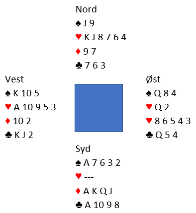 Dermed ble syd spillefører i 2 hjerter redoblet i en farge hun selv er renons, og hvor motstanderen til venstre har åpnet og vist femkorts farge!