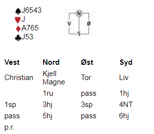 5 hjerter viste 2 ess uten trumfdame, og syd tenkte en stund før hun løftet til 6hj.