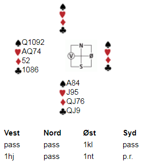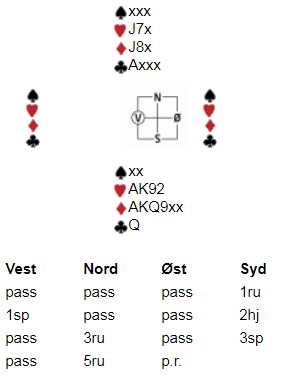 Jeg har saksa ut følgende spennende spill fra tirsdagens spilling, som inneholder meldetekniske såvel som spilletekniske poenger: