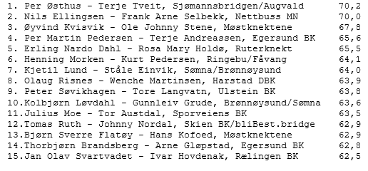 Resultater her:www.bridgekrets.no/var/ruter/html/9901/2017-12-07.htm