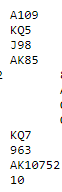 Siden ruter 10 og ruter knekt var på plass er slemmen ikke så verst, kun avhengig av å løse ruteren uten taper. Det er et rent valg, ikke så langt unna 50/50 om man skal toppe eller ta finesse etter først å ha spilt en stor ruter fra syd (for å gardere mot singel dame hos vest). Best er det i første ruterrunde å spille knekten fra nord, av og til har du en motspiller som dekker med damen tredje (svært dårlig motspill om man vet syd har lang ruter). Slik så hele spillet ut: