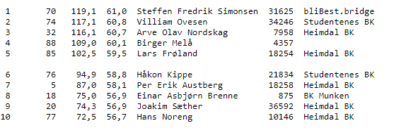 Det ble jevnt i toppen, og Steffen Fredrik Simonsen snek seg foran de andre med noen få poeng. Han vant foran William Ovesen med Arve Olav Nordskag på 3.plass.