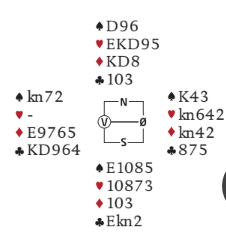 Vest spilte ut kløver konge til esset. En trumf til nord avslørte at øst skulle ha trumfstikk. Da så det unektelig ikke lyst ut, hvordan skulle han kunne unngå en taper i hver farge? Espen spilte ruter konge til vests ess. Tilbake kom en ruter til damen. Nå forsøkte nordmannen liten spar til åtteren. Håpet var at øst la liten fra K-kn-x slik at syd kunne få lurt til seg det stikket, så kaste en spar fra nord senere på godspilt kløver knekt. Men dette lyktes ikke da hele spillet så slik ut: