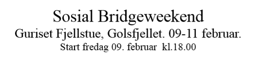 Fredagsbridge på hotellet i Sogndal den 12. januar kl. 1800. Påmelding seinast torsdag på NBF si heimeside.