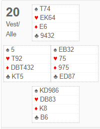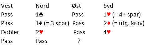 N/S bruker altså overføringer som svar på 1 kløver, og nord har dermed vist spar (først) og hjerter. Øst vet derfor at makkeren har singel spar, for nord som viste sparfarge først og deretter meldte 4 hjerter må ha femkorts spar og firekorts hjerter, med 4-4 ville han innledet med å vise den laveste fargen. Men makker har utspillet, og det er ikke sikkert han spiller ut spar selv med singelton, for han har trolig en god ruterkombinasjon å spille ut fra. Så fra hans synsvinkel kan det godt være at sparutspill kun hjelper spillefører til å plassere sparen, kanskje til og med rulle opp makkerens sparkombinasjon. For å sikre seg at makker spiller ut spar bør kanskje øst doble? Han kan jo nesten se beten med spar til esset, spar til stjeling og kløver til øst som kan gi nok en sparstjeling. Og øst vet at syd har tre spar, så makker vil kunne få to sparstjelinger. Doblingen må be om spar ut her, for vest kan jo se at øst ikke har doblet på trumflengde. Slik så hele spillet ut: