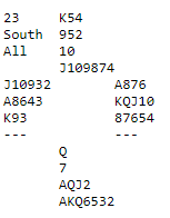 "Jo", sa han og lysnet betraktelig i stemmern, "du satt i tredje hånd og åpnet med kongen tredje i spar, hjerter ess, dame fjerde i ruter.....Hva er det nå da?"