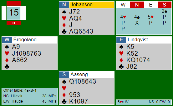 Etter pass fra Jon Martin svarte jeg 2 hjerter, det gikk så to ganger pass før Tøsse doblet opplysende og Norstad svarte da 4 spar. Liten hjerter kom ut til esset og ny hjerter fra Syd. Hvordan ville du spilt som Vest? Gorm regnet med åt Nord hadde åpnet med 6- kort hjerter og sakte kløver i håp om at hj D som måtte bli god kunne gi avkast av den andre taperen i kløver også (vanlig taper på taper- spill). Men Arne stakk med kongen og på nok en hjerter ble damen trumfet med 10-eren. Marthinussen hadde altså åpnet med 7- korts farge! Sp 10 ble stukket med kongen og liten trumf gikk til 5-er og hva bør legges fra bordet? Gorm gikk opp med esset, og min dame i Syd kom på. Nå kunne ikke taperen i kløver unngås, og 10 stikk ga dem -3 mens 11 stikk ville gitt +5. Kl K satt nemlig i Nord som hadde sp 54- hj KJ108764- ru 54- kl K5.
