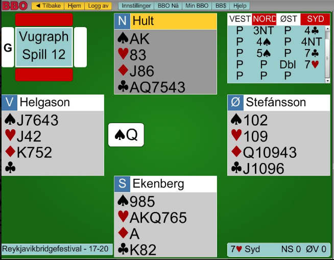 Da nord hadde vist kløverfargen og senere foreslo 3NT (i meldingsforløpet som er vist mangler meldingene opp til 3NT) sleminviterte syd ved å støtte kløveren. Deretter meldte de seg opp i 7 kløver som er en meget god kontrakt om en ser kun på N/S sine kort. Men siden trumfen sitter 4-0 er storelslemmen dødfødt. Da kom øst til med en hjelpende hånd og doblet! Svenskene trodde på øst og flyttet til 7hjerter som ikke kunne rokkes da det var majortilpasningen på åttekort som satt fint hos motparten. Etter uttrumfing kunne kløverfargen godspilles med en stjeling og det var tretten stikk. Pluss 2210 ga tredelt nest-topp bak et par som tok toppen for +2470 i 7 hjerter doblet. Snakk om mislykket dobling!