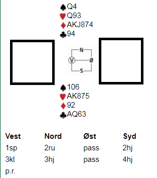 Du har i gunstig sone meldt deg opp i 4 hjerter, etter at vest har meldt både spar og kløver.