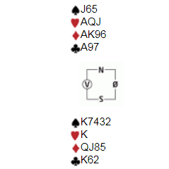 Vest gir, Øst- Vest i faresonen. Vest åpnet med 1 hjerter og Nord meldte inn en «komisk grand» Øst sa 2 ruter som Syd doblet. Det er en styrkevisende dobling som ber Nord fortelle hvilken farge han har. Vest sa imidlertid 2 hjerter. Pass fra Nord og Øst løftet til 4 hjerter. Syd var jo hele tiden klar over at det var kløverfarge makker hadde, og han stampemeldte nå i 5 kløver. Vest doblet med pass rundt.