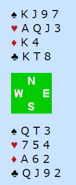 Nord åpnet med 1kl, syd meldte 1NT, og nord avsluttet meldingsforløpet med 3NT.