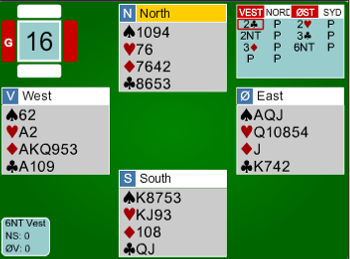 Brogeland og Lindqvist endte i 6 grand som skulle spilles av vest. Det var litt uheldig, for kontrakten er bedre om øst er spillefører. Ved de fleste andre bordene var 3 grand kontrakten, som regel spilt av øst, og da var det ganske enkelt å få tolv stikk, spesielt der spar kom i utspill fra syd. Det skjedde også ved det andre bordet i nordmennenes kamp.