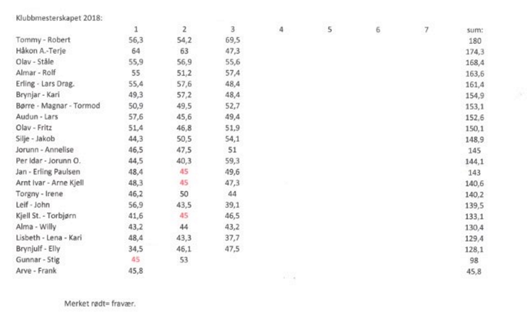 20 par deltok 3. spillekveld av Klubbmesterskapet 2018. Turneringen blir spilt som Monrad i en pulje. Vinnere ble Tommy Elde (bildet) - Rune Ditlefsen foran Per Idar Hoel - Jorunn Ovesen på andreplass og Almar Olsen - Rolf J. Lehn på tredjeplass.