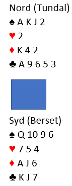 Tre ganger pass til Ove som åpnet forsiktig med 1 hjerter. Nord doblet nå opplysende (viser sparfarge samt kort å kunne kjempe om kontrakt på), og Anders passet. Syd meldte 2 kløver som logisk benekter sparlengde og nå hoppet Gundersen til 4 ruter. Etter pass fra Nord mannet så Fugleneb seg opp og meldte lilleslem- 6 ruter var de alene om å komme i.