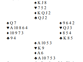 I lagkamp bør det tenkes litt annerledes, overstikkene er ikke så viktige. Da er det antagelig riktig å spille på kombinerte sjanser for å forsøke å vinne kontrakten. Man kan ta for A-K i spar for å se om spar dame faller, og det gjør den jo i dette tilfellet så kontrakten er sikker! Hvis ikke spar dame faller må kløverfinessen forsøkes.