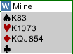 Grude-Johansen sitt lag GROSSACK møtte profflaget SCWARTZ. På det norske parets lag spilte en kjenning av meg her Down Under, Liam Milne fra New Zealand (nå bosatt i Australia). I andre sett (av 3) fikk han og Bart Bramley bra draget på det og det så ganske lovende ut en lang stund. Etter en bra start på runden satt Milne vest med disse kortene: