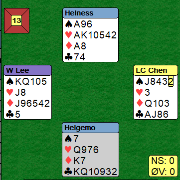 Ved det ene bordet stoppet N/S i utgang, men Helness-Helgemo meldte seg frem til den glimrende slemmen 6 hjerter. Den er dog kun sikker helt til man ser at Ø/V kan få seg en kløverstjeling med kløver ess ut, men skjer det er det uflaks. Og det må kløver ut mot kontrakten som spilles av nord. Heldigivis fant ikke øst utspillet av kløver ess og det ble fortjent (synes jeg) slem til bokføring for det norske paret. Et slikt spill svinger 26 IMP (13 inn i stedet for 13 ut om dte blir bet), og det avgjorde på en måte kampen skulle det vise seg.