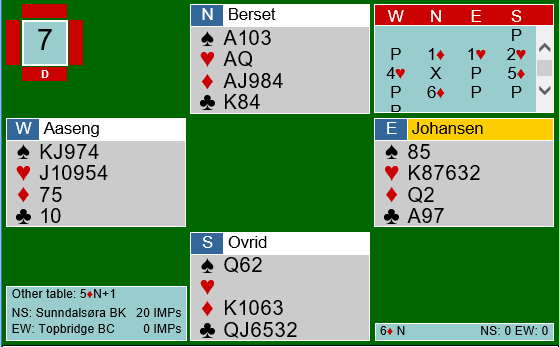 Ved de åtte bordene var Berset-Ovrid de eneste som noterte 1370, det var ellers fem utganger i 5 ruter og to par som spilte motspill mot 4 hjerter doblet for +500.