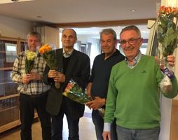 På sesongens siste spillekveld - mens de frammøtte hygget seg med snitter og godt drikke - tok klubbens leder ordet, og kunngjorde utnevnelsen av fire høyst fortjente æresmedlemskap til (fra venstre mot høyre): Bjørn Sundeng, Ivar Hovdenak, Steinar Nordli og Tore Breilo.