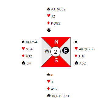 Syd valgte ikke unaturlig spar 8 i utspill, og det gikk dame, ess og stjeling. Spillefører tok for ess og konge i hjerter, og syd kastet kløver konge. Så fulgte kløver 2 fra øst, og husk at østs kort er skjult! Husk også at syd hadde hørt makkeren støtte til 5 kløver. Syd syntes det så ut som en god ide å få nord inn for å få ruter gjennom spillefører, og la kløver 3! Dermed vant kløver 4 stikket, og spillefører kunne kaste en ruter på spar konge før det kun ble to rutertapere. Elleve stikk og +650 til Ø/V!