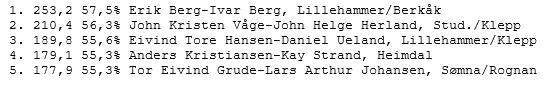 Nr. 16 Sigurd Evjen 327,6, nr. 16 Marius Leikvold 327,6, nr. 24 Asbjørn Rust 315,6, nr 68 Ola Magne Kirkebøen 314,3, nr 73 Bjørn Morten Halbjørhus 313,9, nr 266 Svein Bækken 296,0, nr 333 Vidar Corneliussen 291,9, nr 333 Kolbjørn Vincent 291,9, nr 350 Olav Syversbråten 290,9.