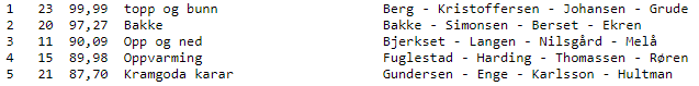På tredjeplass fulgte "Opp og ned" (Stein Bjerkset, Asgeir Langen, Ola Melå og Pål Nilsgård). Bak dem igjen var det tett som hagl. Her er listen over de fem beste lagene: