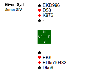 Spillefører stakk med esset, tok 2 runder spar, spilte hjerter til kongen og kastet bordets siste hjerter på spar 10. Nå var det bare å stjele en hjerter med kløver dame, og trekke ut trumfen for 12 stikk og 920 til Sverige.