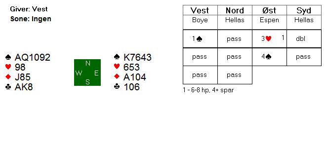 Espen spilte ut hjerter ess, der vest la knekten, og skiftet til liten spar. Går nord opp på kongen, kan han ta 11 stikk og 14 IMP til Hellas, men siden Boye doblet 3NT, var han sikker på at spar ess satt bak. Han la derfor liten spar og Boye vant stikket med 10'eren.