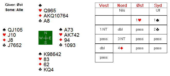 I åpent rom meldte Nils og Ulf seg opp i 3nt, men da grekeren i vest doblet, ble Nils redd for gjennomspill i spar, etterfulgt av gjennomspill i hjerter.