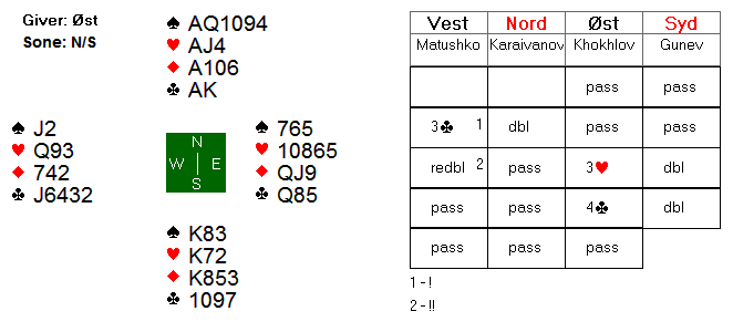 Nord doblet og Gunev passet ned, og da fikk vest så dårlig samvittighet for åpningen at han redoblet sin egen sperremelding for uttak!!
