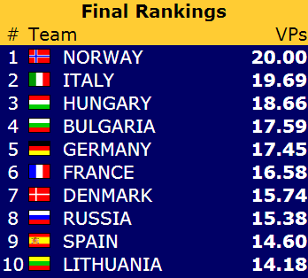 Den gang ble Norge nummer 13 med 237 VP, og var altså omtrent 27 VP fra å kvalifisere seg for VM. I år er det åtte plasser til VM, og dermed er det altså et par VM-plasser til å kjempe om. Sist gang var det drøyt 20 poeng opp til Irland på 8.plass.