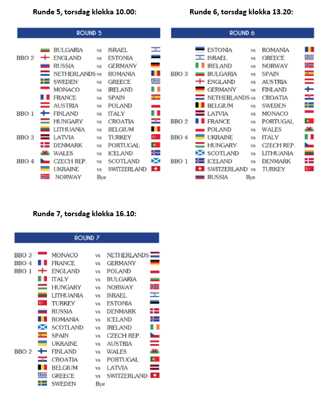 Dagens siste runde, som starter klokka 16.10, er spekket med storoppgjør. Vi kan blant annet følge Geir Helgemo, Tor Helness og resten av Monaco i kampen mot Nederland. Monaco hadde en førstedag på det jevne, og ligger like over middels.