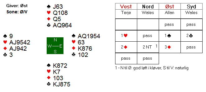 Terje i vest fikk forklart at nords 2NT var naturlig, og da var det lite fristende å stå på mot utgang, da han visste at nord satt bak med hjerterhonnører.