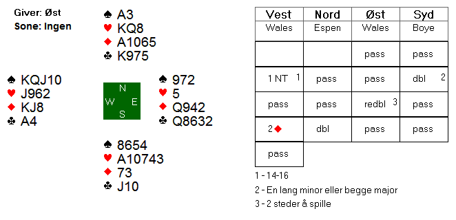 Espen valgte å åpne i 2 kløver på hånden i nord, og da ble det vanskelig for motparten å komme inn. Øst meldte inn 2 ruter, men etter systemet viste dette 4+ spar + en minor. Øst hadde glemt dette, og vest fant aldri ut hvilken minor makkeren hadde, og Espen fikk spille 4 spar for 10 stikk og +620.