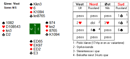 Det ble meldt og vunnet slem ved seks av totalt 76 bord i de tre klassene. Litt utur for Norge. Imidlertid må det sies at russerne kanskje hadde fått det litt verre om Ulf hadde sperret i første melderunde. Men øst-vests avtaler tillater kanskje ikke at det sperremeldes på denne håndtypen? De aller mest aggressive vil vurdere å åpne med 3 hjerter i første hånd i disse sonene. Det er dog ikke mitt personlige valg! Men om det går 3 hjerter - pass - pass, hva annet skal syd melde enn 3 grand?