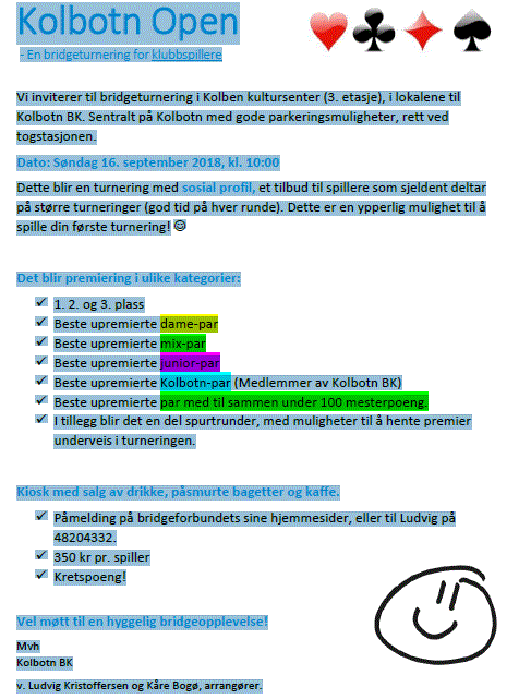 Kolbotn BK med initiativtakere Kåre Bogø og Ludvig Kristoffersen vil 16/9 arrangere en turnering i Kolben. Vi håper på stor deltagelse. Turneringen er spesielt tilrettelagt relativt ferske spillere.