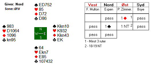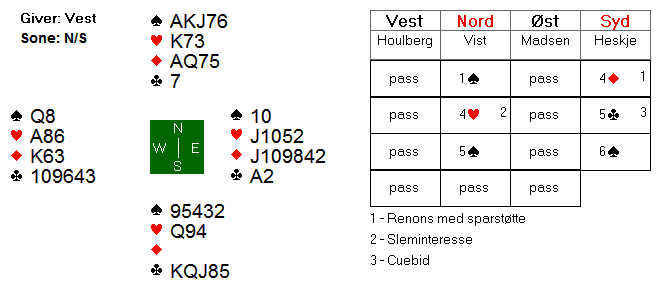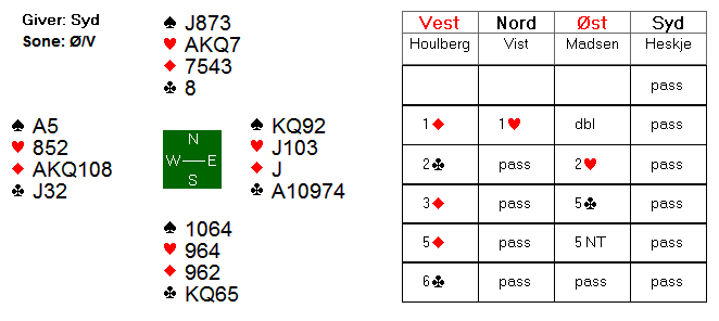 N/S har en enkel utgang i spar, men Ø/V har en glimrende stamp i 5 ruter.