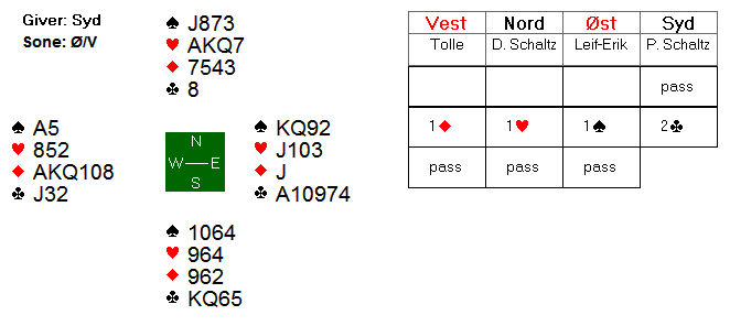 I seniorkampen kom danskene i 3NT etter 1NT-åpning i vest, mens Tolle ville ikke oppvurdere til 1NT med få oppspillsverdier, og åpnet derfor med 1 ruter. Nord meldte inn 1 hj, men over 1 spar sa syd 2 kløver! Leif-Erik var ikke sikker på om de hadde utgang i kortene, og var usikker på om han ville doble 2 hjerter, så han passet ut 2 kløver og hentet 5 beit. 250 holdt ikke mot 600 på andre bordet, og 8 IMP gikk til Danmark.