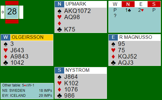 Island doblet 5 ruter mot Sverge og noterte kun +100. Islands Ø/V stampet også, men Upmark-Nystrøm meldte 5 spar. Sverige sto da i fare for å tape spillet da 5 spar fort går bet.