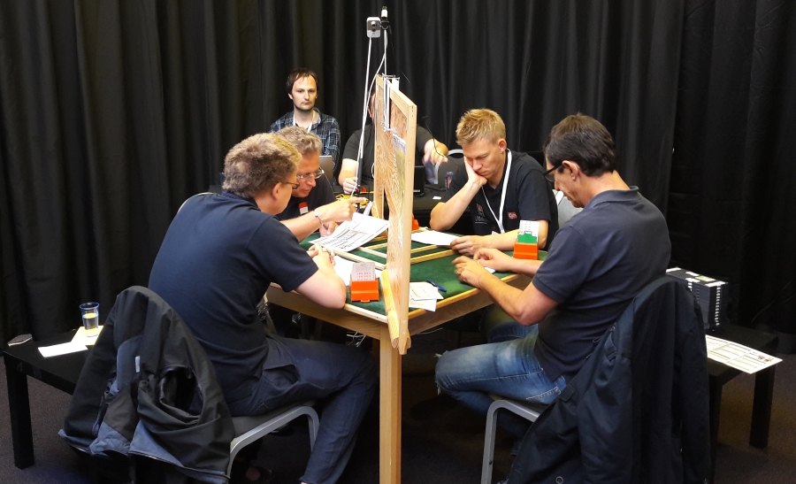 I skrivende stund er dagens siste kamp godt i gang. To av Norges lag overføres på BBO. I åpen klasse møter Norge Monaco (med Geir Helgemo og Tor Helness). I dameklassen møtes Norge og Danmark. I veteranklassen møtes også Norge og Danmark, men denne kampen overføres ikke på BBO. Under kan du se noen bilder fra de norske BBO-oppgjørene.